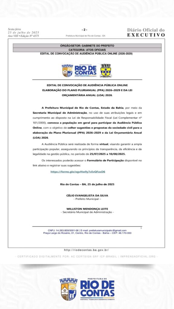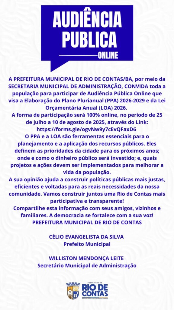 A PREFEITURA MUNICIPAL DE RIO DE CONTAS/BA, por meio da SECRETARIA MUNICIPAL DE ADMINISTRAÇÃO, CONVIDA toda a população para participar de Audiência Pública Online que visa a Elaboração do Plano Plurianual (PPA) 2026-2029 e da Lei Orçamentária Anual (LOA) 2026.
