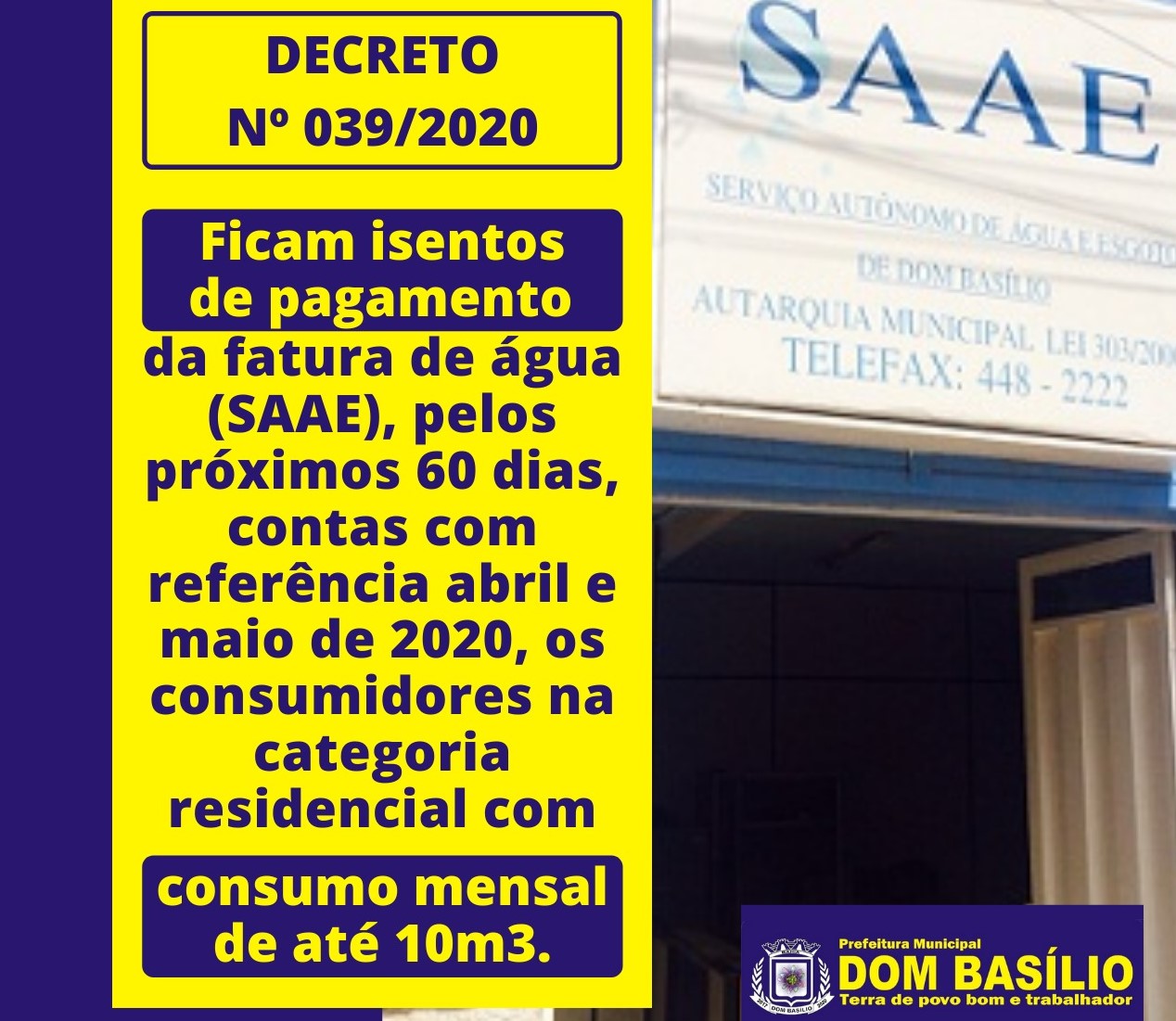 Diante da crise em decorrência da pandemia pelo Covid-19, o Serviço Autônomo de Água e Esgoto de Dom Basílio (SAAE), órgão da gestão responsável pela captação, tratamento e distribuição de água potável a população, isentará moradores do pagamento da conta de água , pelos próximos 60 dias.