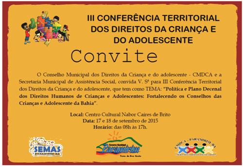 A III Conferência Territorial dos Direitos da Criança e do Adolescente acontecerá nos dias 17 e 18 de setembro à partir das 8:h, no Centro Cultural Nabor Cáires de Brito. Na oportunidade, serão discutidas as propostas que irão nortear a construção do Plano Decenal dos Direitos Humanos de Crianças e Adolescentes e o fortalecimento dos Conselhos das crianças e adolescentes da Bahia. A Conferência territorial, contará com a presença de representantes dos municípios que compõe o território.
