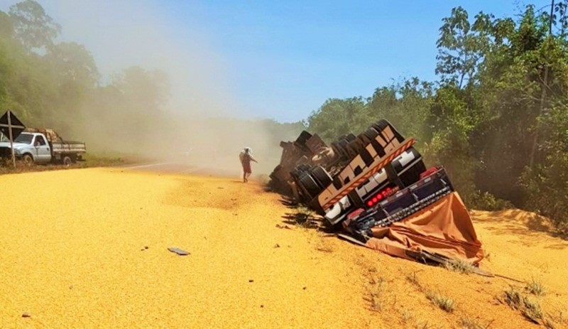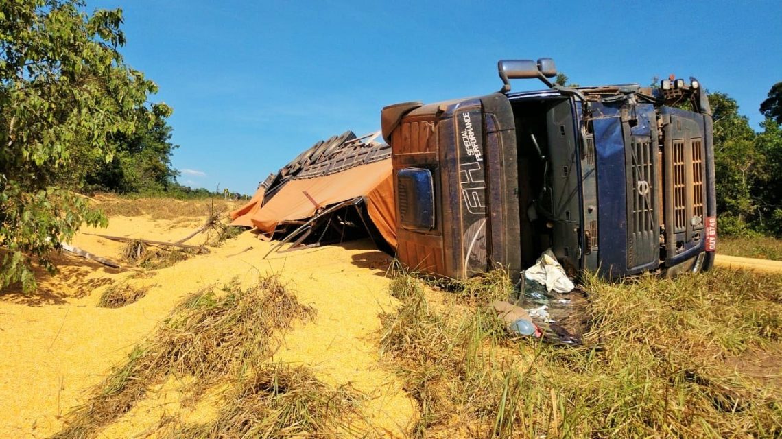 Mulher que também viajava na carreta morreu no local, após veículo tombar em curva na MT-140.