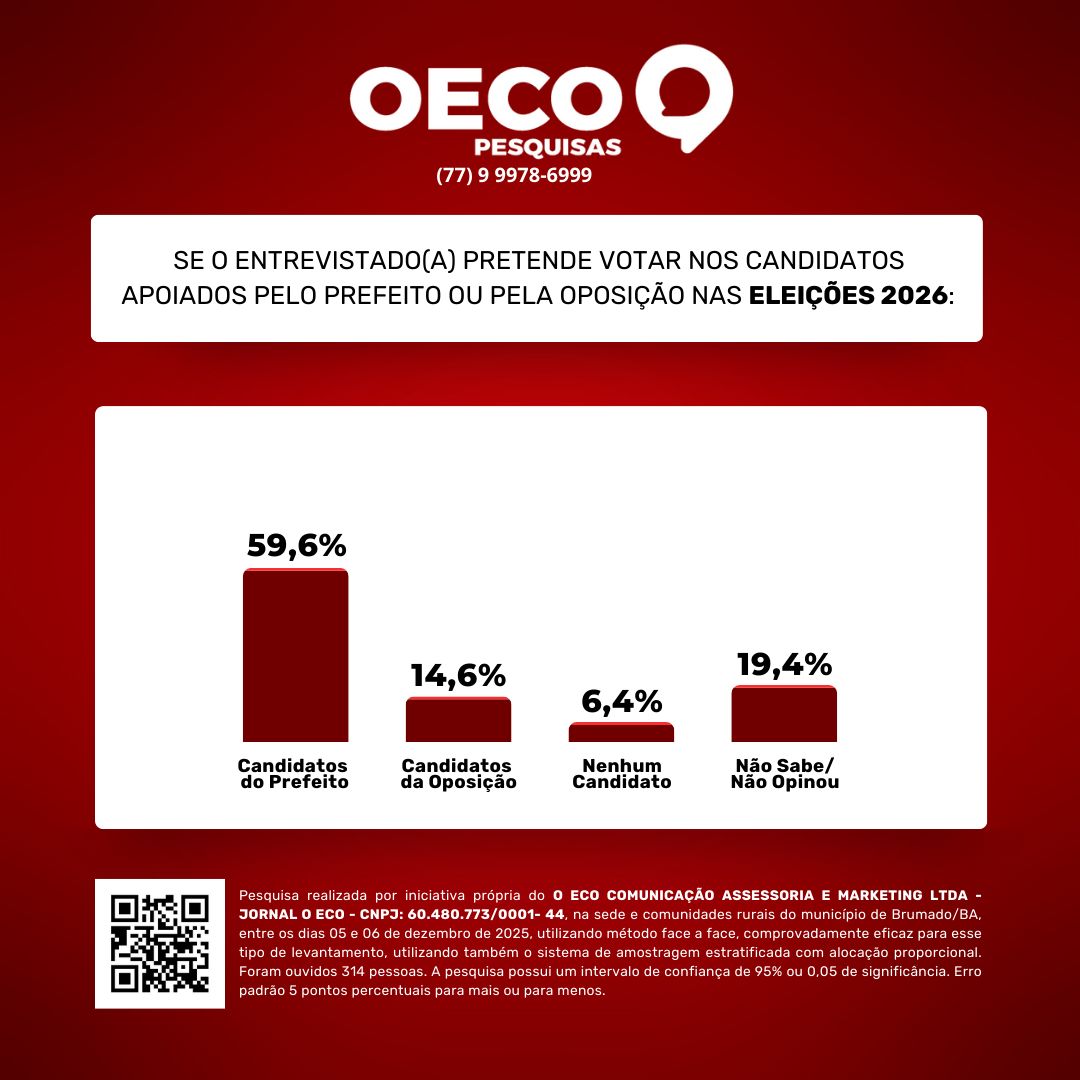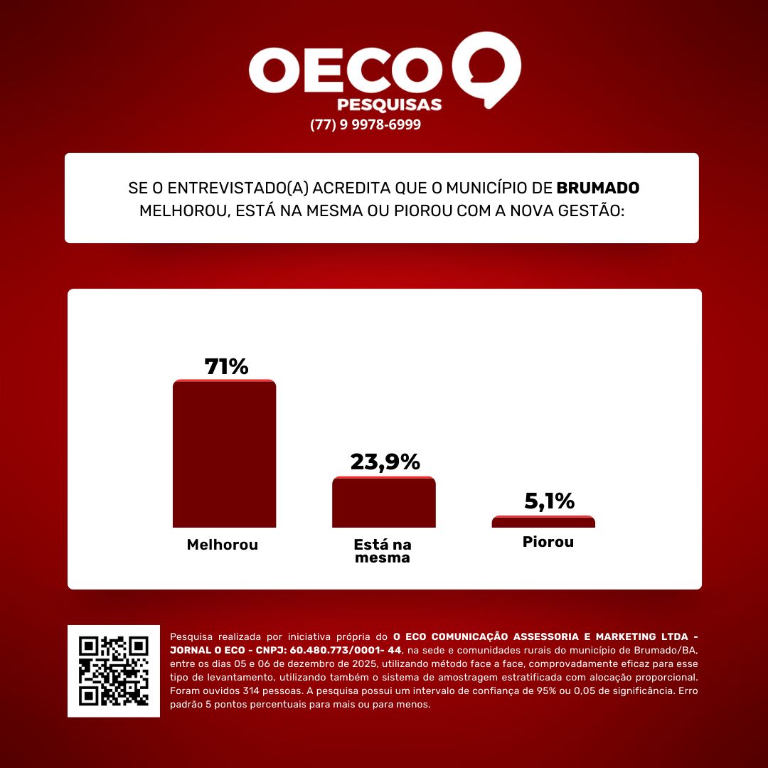 A mais recente pesquisa realizada pelo Instituto de Pesquisas O Eco, entre os dias 05 e 06 de dezembro de 2025, revelou uma avaliação amplamente positiva do primeiro ano de governo do prefeito Fabrício Abrantes, em Brumado. O levantamento, aplicado de forma presencial (face a face) na sede do município e em comunidades rurais, seguiu um plano amostral estratificado com alocação proporcional, metodologia reconhecidamente eficiente e utilizada pela maior parte dos institutos de pesquisa do país. Ao todo, foram entrevistadas 314 pessoas, distribuídas por diferentes faixas de idade, escolaridade, renda e ramos de atividade. A pesquisa conta com intervalo de confiança de 95% e erro padrão de 5%.